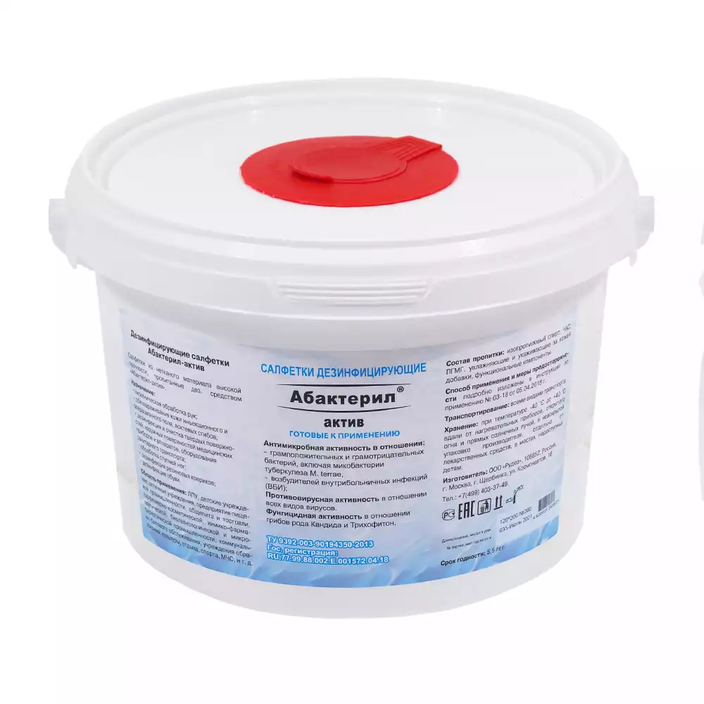 Салфетки "Абактерил - Актив", дезинфицирующие, размер 12*18см, в ведре 120шт, готовые к применениюРудез (РОССИЯ)