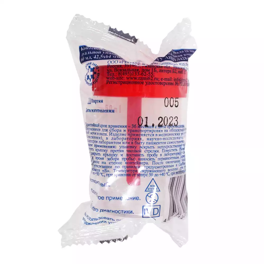 Контейнер 60мл, для взятия биоматериала, со шпателем, нестерильный, индивидуальная упаковка, РЗМИ (РОССИЯ)
