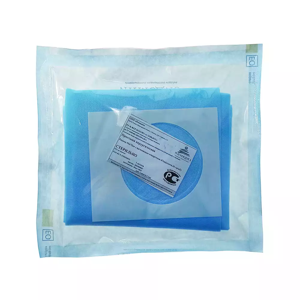 Простыня 75*90см, материал СМС 42г/м2 с отверстием 7см, с липким краем, стерильная, стерильная, Инмедиз (РОССИЯ)