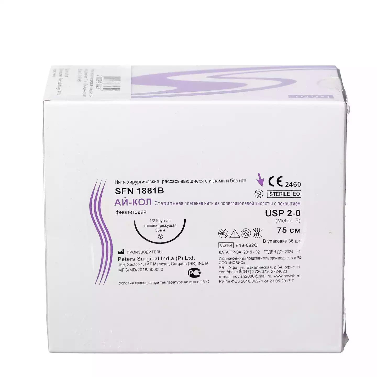 Ай- кол 2/0 (3), длина нити 75см, игла 1/2 колюще-режущая 35мм, упаковка 36шт, SEN 1881BPeters Surgical (ИНДИЯ)