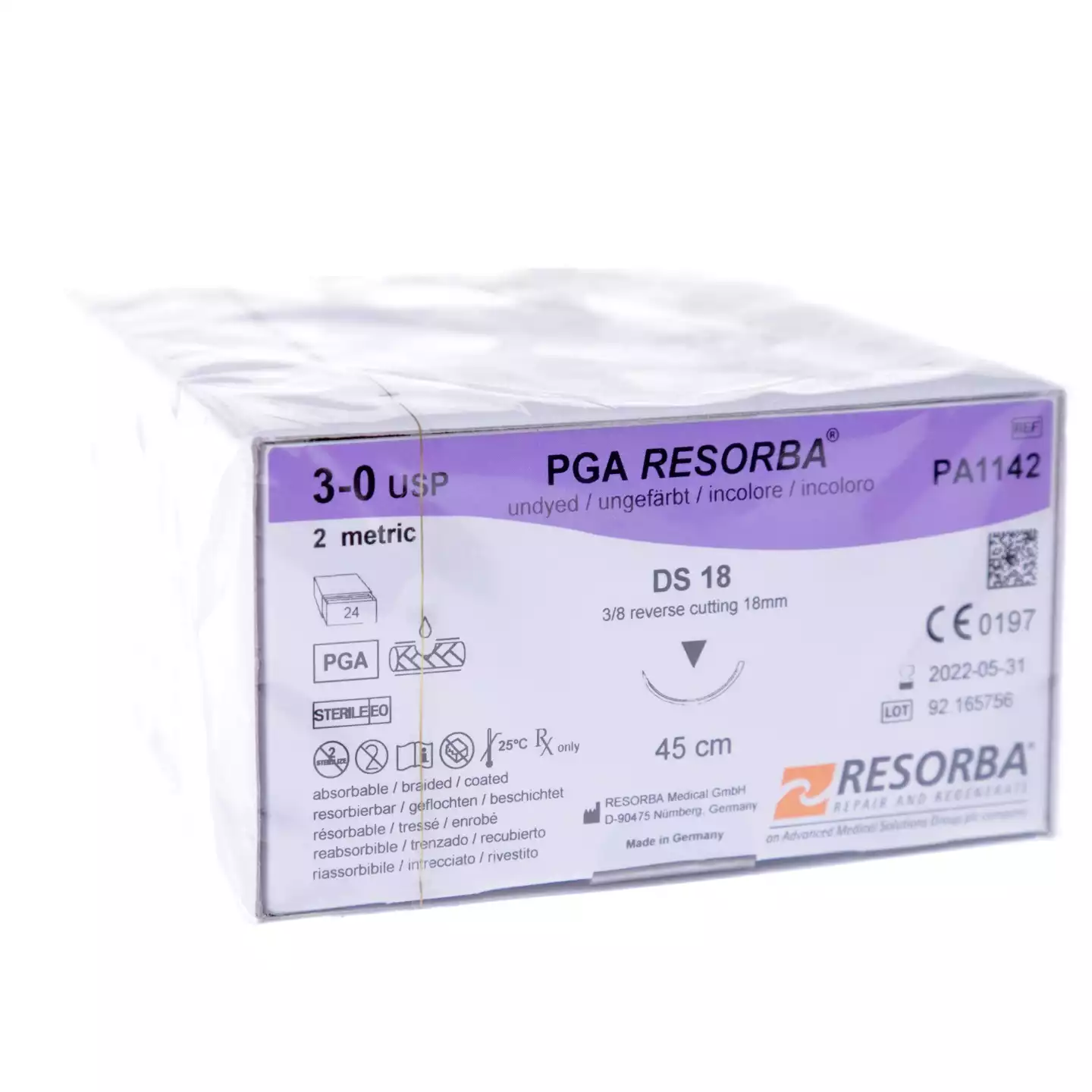 ПГА-РЕСОРБА (PGA) М2 (3/0), длина 45см, игла DS 18 режущая 3/8 круга, неокрашенный, упаковка 24шт, РА 1142Resorba Medical GmbH (ГЕРМАНИЯ)