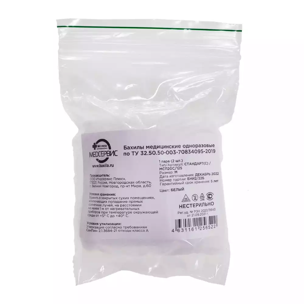 Одноразовые бахилы-носки от производителя «Медсервис» изготавливаются из спанбонда с показателями плотности 15 г/м.кв.