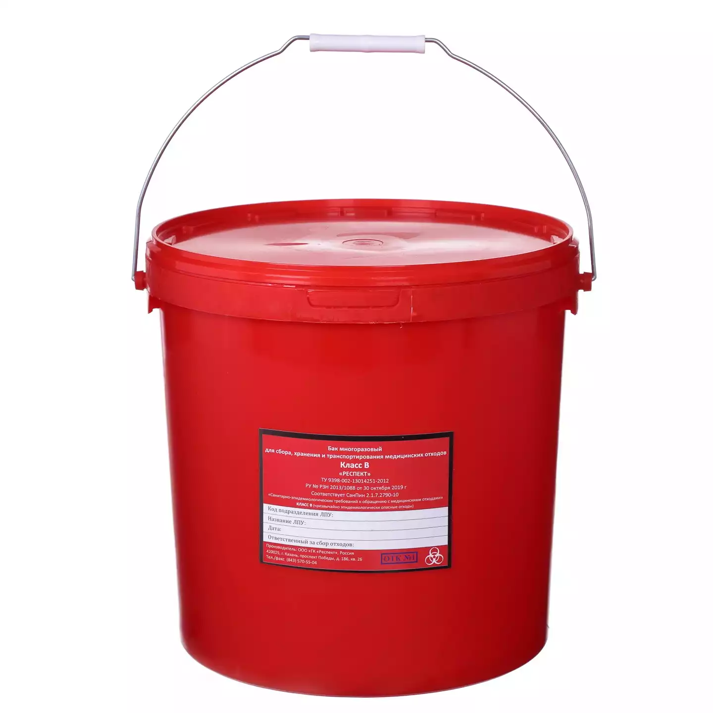 Бак для сбора медицинских отходов многоразовый с крышкой - применяется для сбора отходов всех классов, путем укладывания в него пакета соответствующего класса. Бак для отходов изготавливается из полипропилена и состоит из основы, крышки и наклейки. Бак для сбора медицинских отходов с крышкой красный - соответствует классу "В".