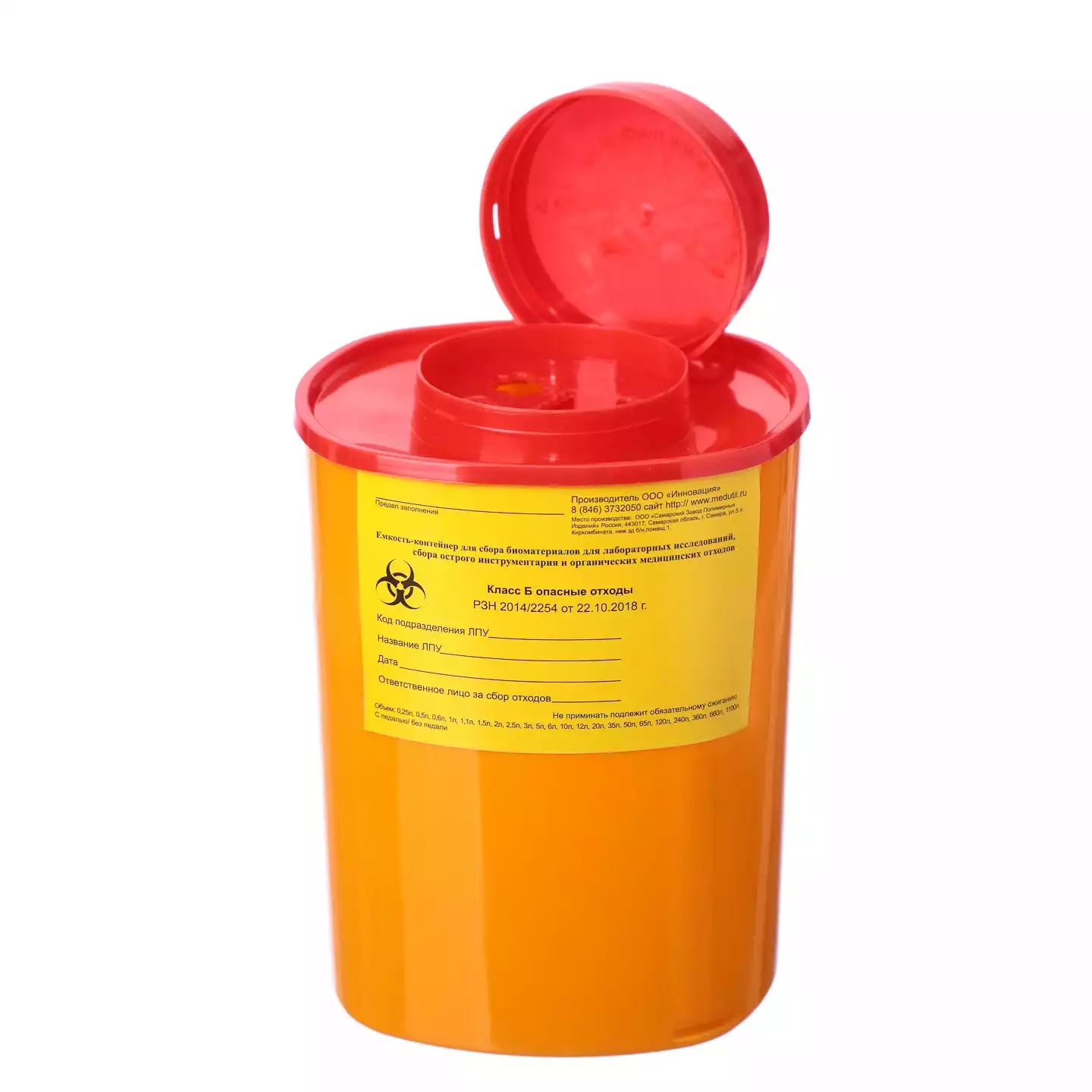 Контейнер-емкость для сбора острого медицинского инструментария объемом 1,5 литра, относящийся к классу Б, выполнен в квадратной форме, окрашен в желтый цвет и предназначен для одноразового использования. Эта емкость оснащена интегрированным иглосъемником, позволяющим безопасно и бесконтактно удалять иглы любой конфигурации. Применение такого контейнера значительно снижает риск получения производственных травм медицинским персоналом.