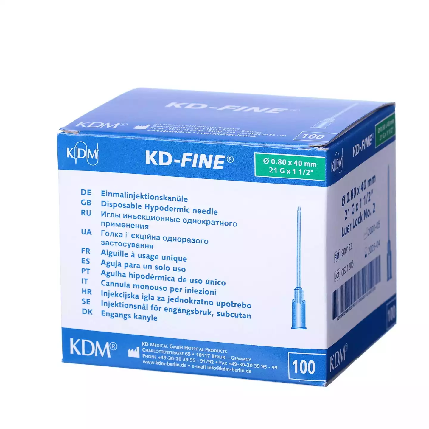 Стерильная инъекционная игла KD-Fine (КД Файн) размера 21G с параметрами 0,8 на 40 миллиметров, оснащенная универсальным разъемом Luer Slip/Luer Lock, имеет зеленый цветовой индикатор.