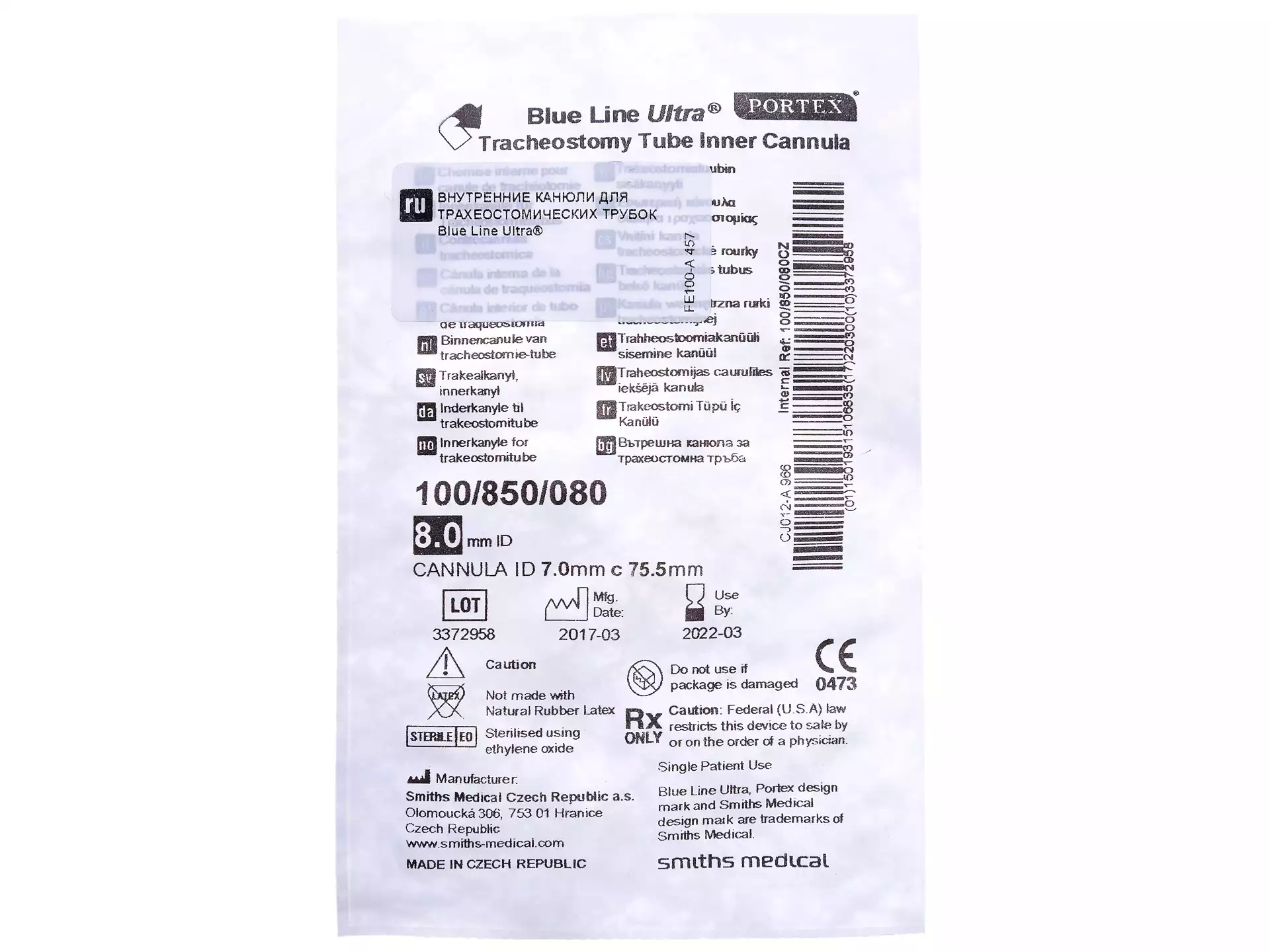 Внутренняя канюля для трахеостомической трубки Blue Line Ultra, размер 8,0, диаметр 6,5/8,0мм, длина 75,5мм, для трубок 100/850 не фенестированная (белая)