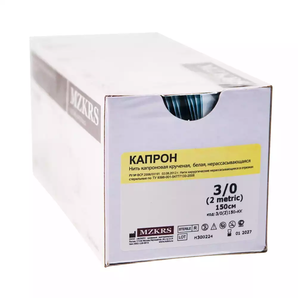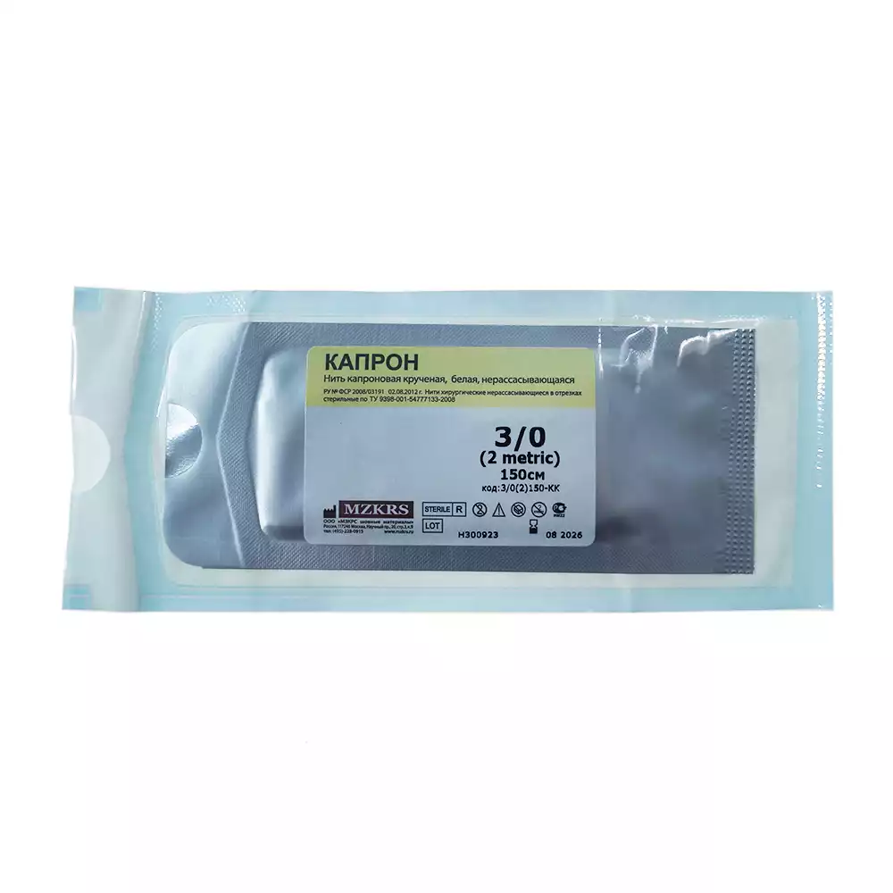 Капрон USP-3/0, ЕР-2, крученый, длина нити 150см, без иглы, неокрашенный, стерильный