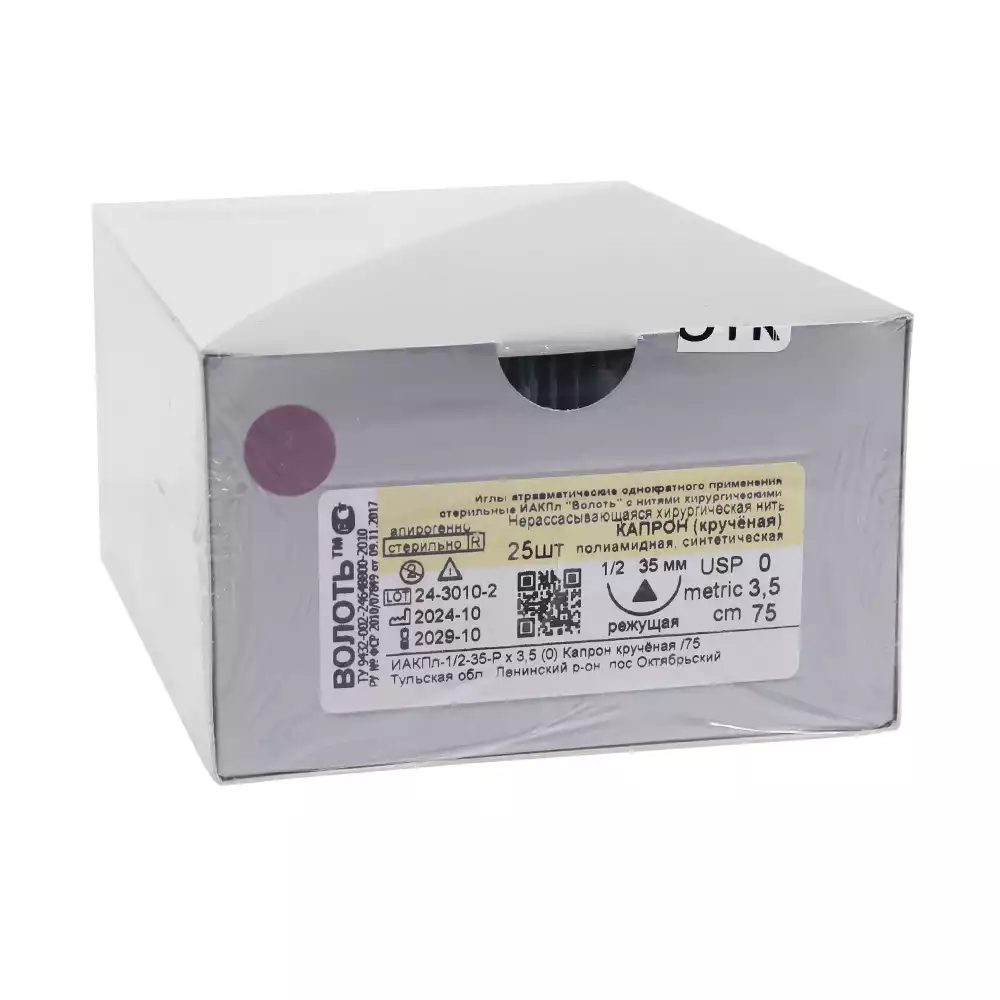 Капрон USP-0, ЕР-3,5, крученый, длина нити 75см, игла режущая, изгиб 1/2 окржности, длина 35мм, стерильный