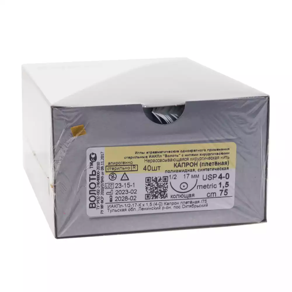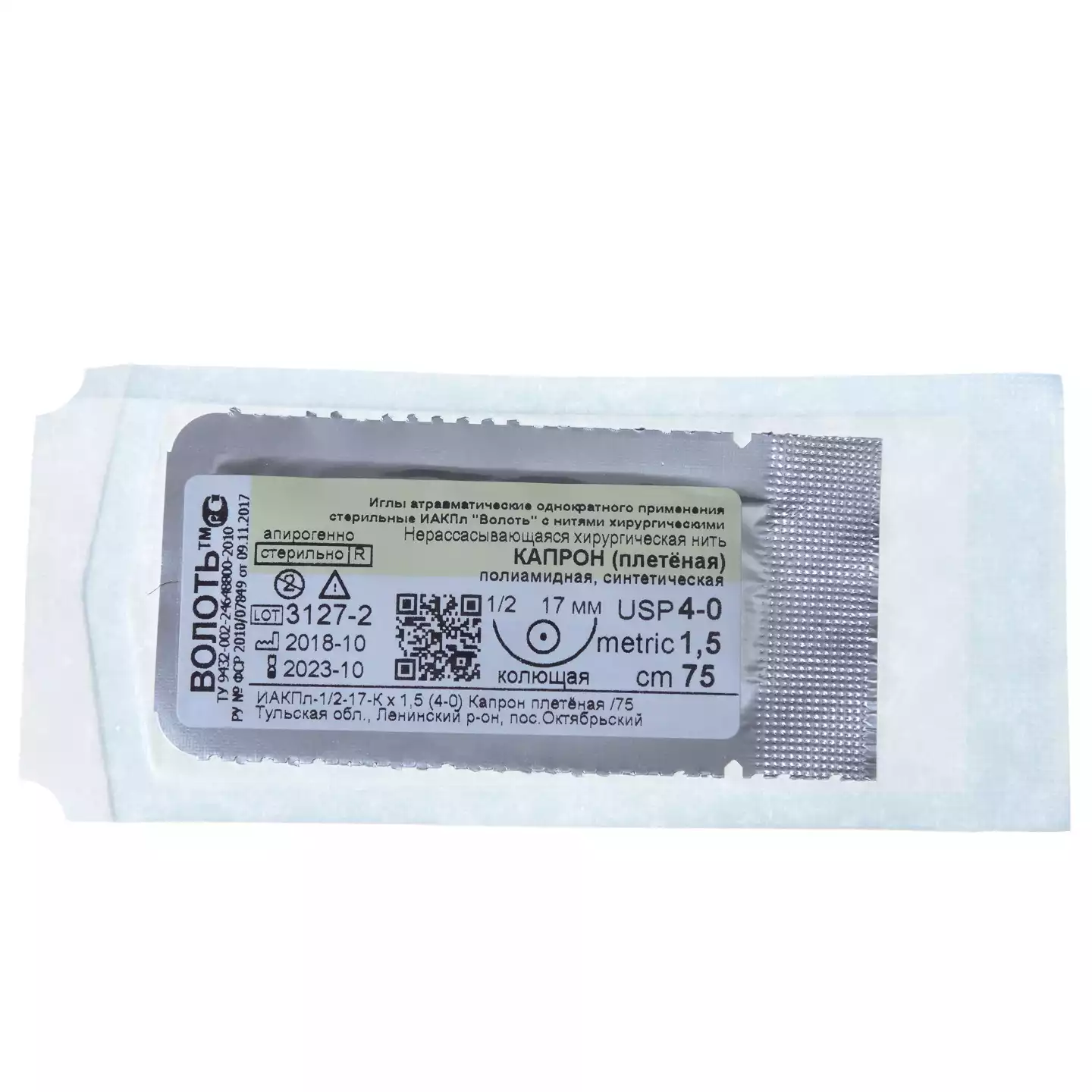Капрон (плетеная) USP №4/0, длина нити 75см игла колющая, изгиб 1/2 окружности, длина 17мм, стерильный