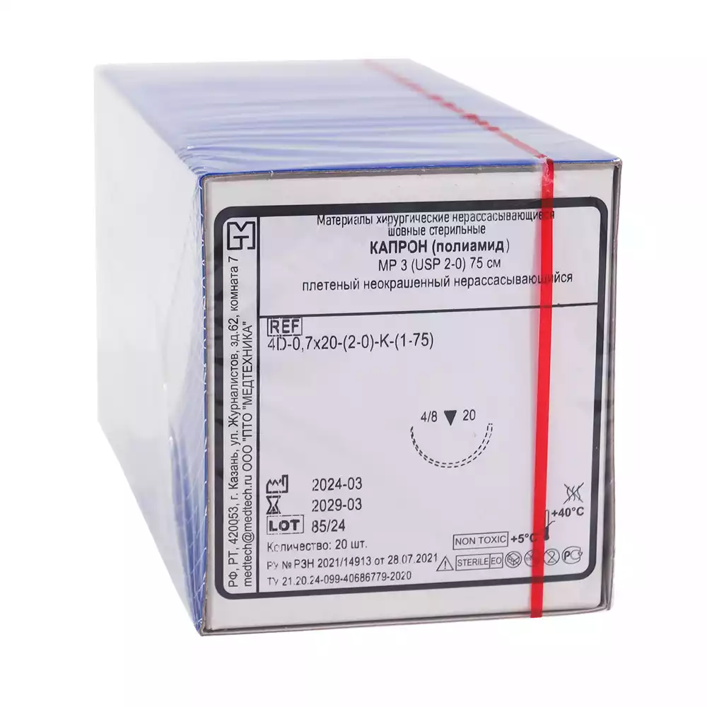Капрон (плетеная) USP 2/0 (МР3), длина нити 75см игла колющая, изгиб 1/2 окружности, длина 20мм, стерильный