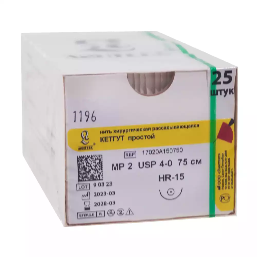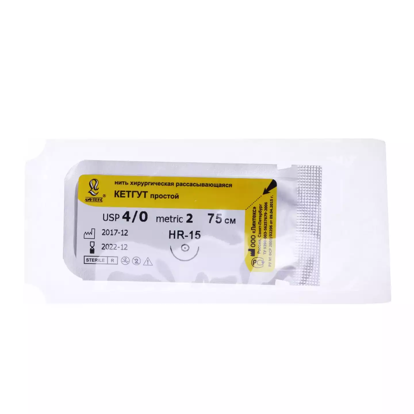 Кетгут простой USP-4/0, ЕР-2, длина нити 75см, игла HR-15 колющая, изгиб 1/2 окружности, длина 15мм, стерильный