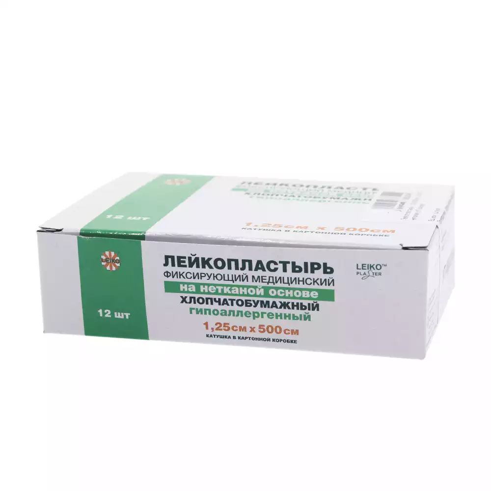 Лейкопластырь LEIKO, на нетканой хлопчатобумажной основе,фиксирующий, размер 1,25см*500см, гипоаллергенный, катушка в картонной коробке