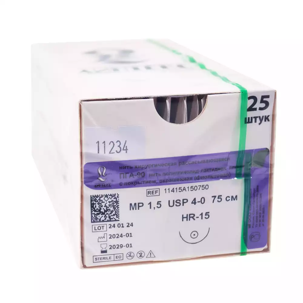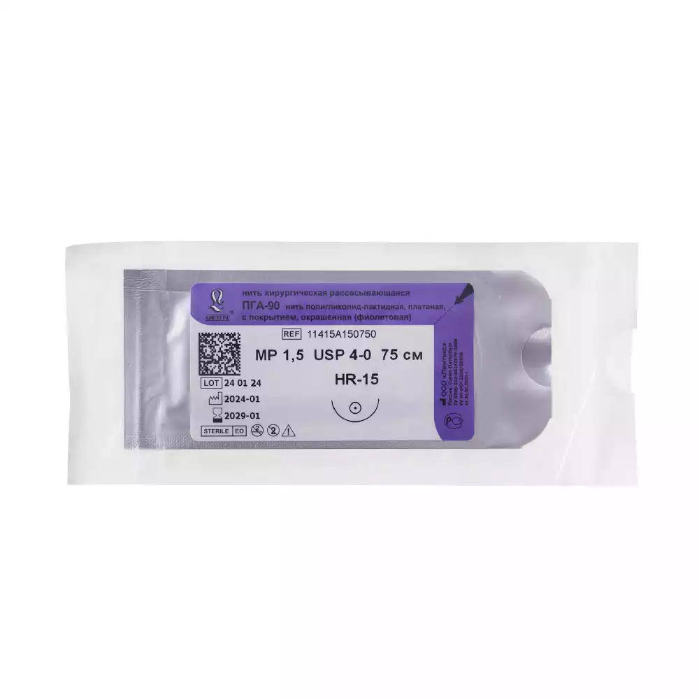 ПГА MP1,5 (USP4-0), длина 75см, игла HR-15, нить полигликолидная плетеная с покрытием, окрашенная (фиол.)
