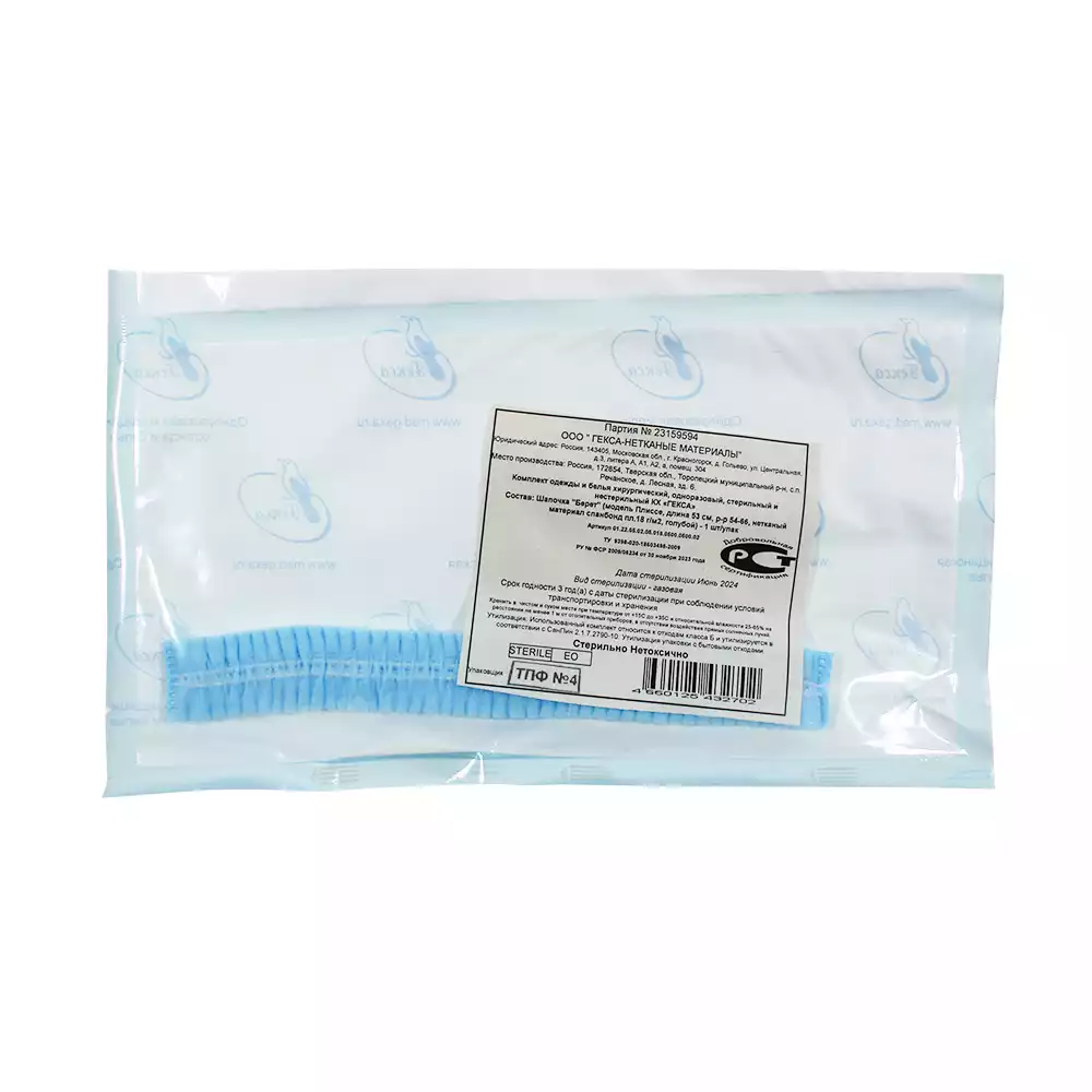 Стерильная шапочка Шарлотта типа клип-берет, выполненная из спанбонда плотностью 18 грамм на квадратный метр, представлена в нейтральном голубом цвете. Эта одноразовая хирургическая шапочка имеет гофрированную конструкцию с двумя защипами, которые обеспечивают дополнительный объем и комфорт при ношении. Вдоль нижнего края шапочки пришита двухрядная резинка шириной от 4 до 6 миллиметров. Такая конструкция гарантирует плотное, но деликатное прилегание к голове, исключая избыточное давление на сосуды и дискомфорт даже при длительном использовании. Диаметр шапочки в растянутом состоянии составляет не менее 53 сантиметров, что позволяет ей подходить большинству пользователей.