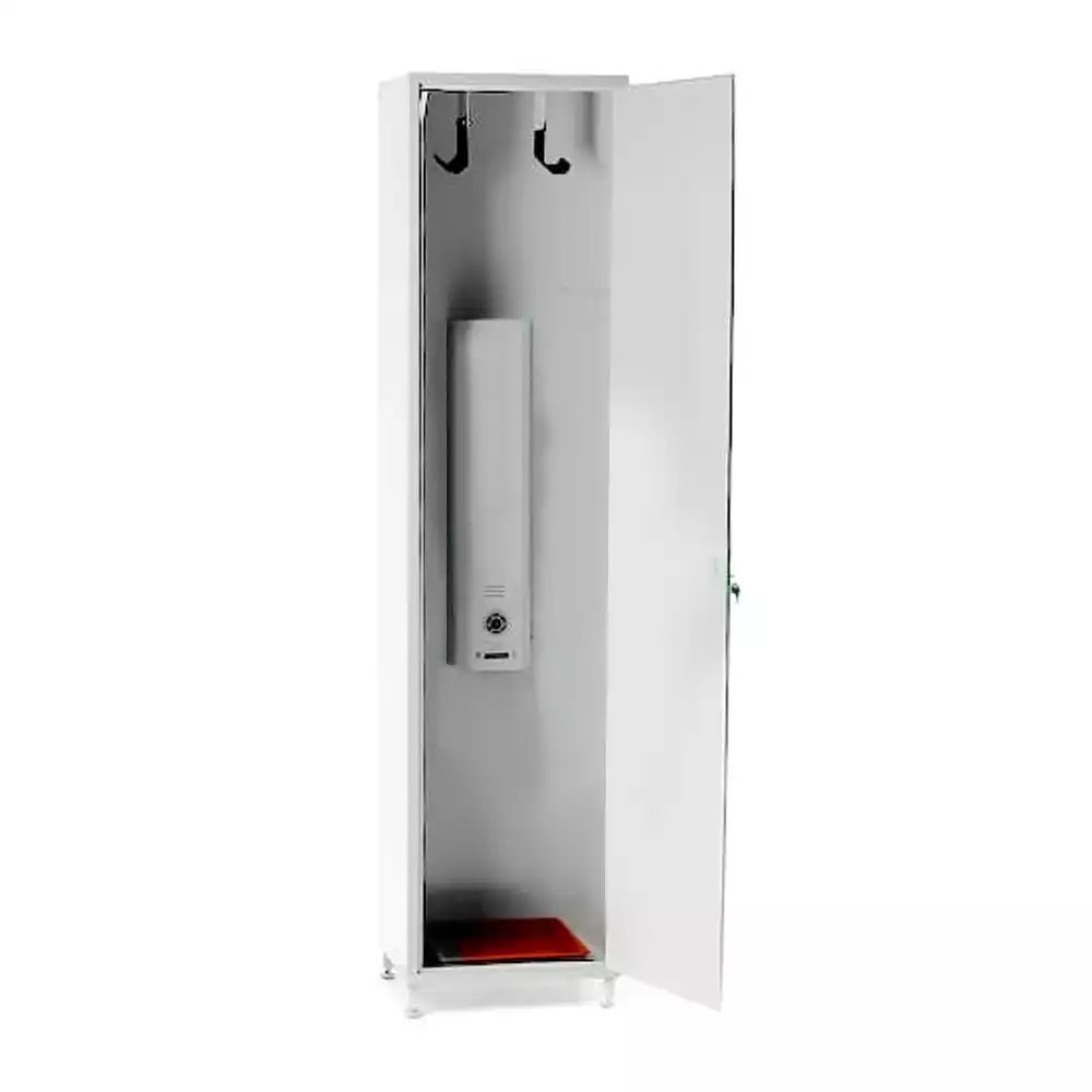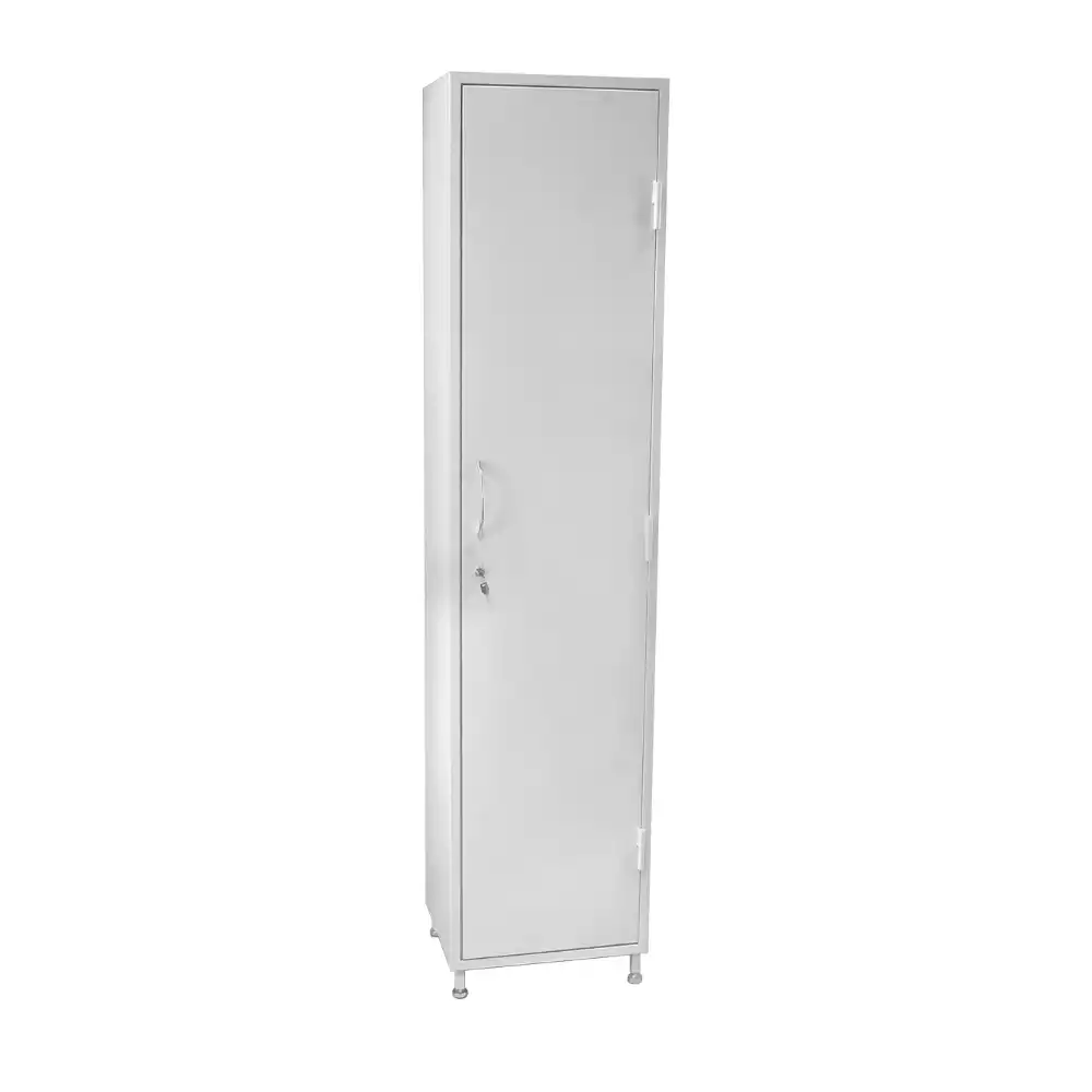 Шкаф одностворчатый, выполнен из окрашенного металла, устойчивого к дезинфицирующим средствам.