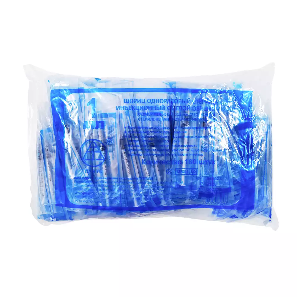 Трехкомпонентный шприц 1 мл, для подкожного вливания инсулина U-100, индивидуально упакованные в блистер.