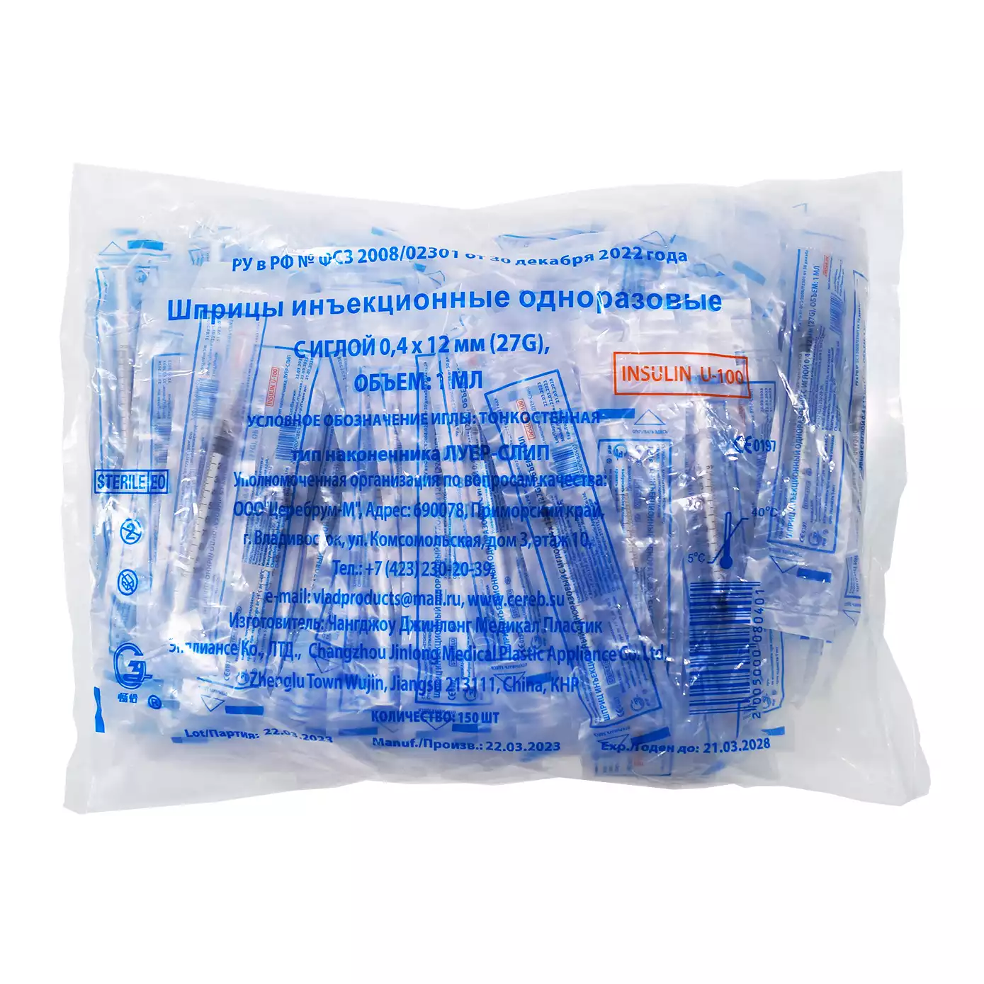 Шприц 1,0мл инсулиновый, 3-х компонентный, игла 27G*1 1/2 (0,40*12мм), стерильный, 150 шт