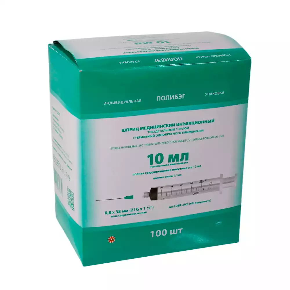 Шприц LEIKO 10,0мл, 3-х компонентный, игла 21Gх1 1/2 (0,8*38мм), соединение Луер Лок, стерильный