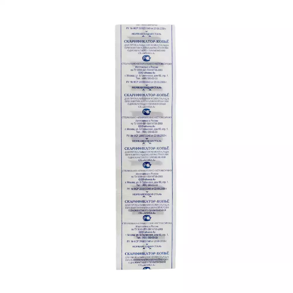 Скарификатор-копье СКБ-32 "Аника А" представляет собой одноразовое стерильное медицинское изделие, предназначенное для получения капли капиллярной крови из пальца. Процедура взятия крови с помощью этого скарификатора необходима для проведения различных лабораторных анализов.