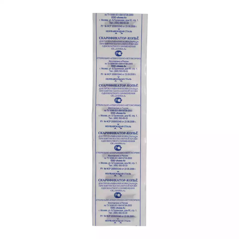 Скарификатор-копьё СКЦ-32 "Аника А" предназначен для прокалывания кожи пальца при взятии капиллярной крови с целью проведения лабораторных исследований.