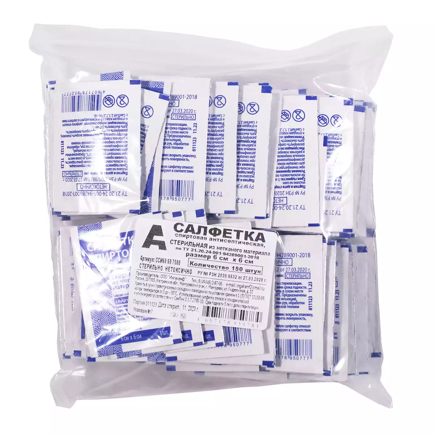 Салфетка спиртовая антисептическая СТЕРИЛЬНАЯ, для инъекций, размер 60*60мм, 70% этиловый спирт