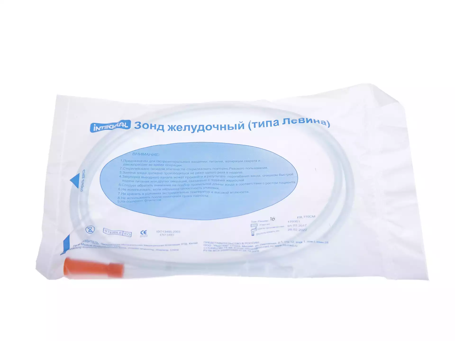 Зонд желудочный - полая трубка, дистальный конец которой имеет закругленный, запаянный, мягкий кончик, который минимизирует травматичность при постановке, другой конец заканчивается универсальным катетером (портом), цвет которого классифицируется по размеру зонда. По всей длине зонда желудочного одноразового имеется рентгеноконтрастная полоса и метки расположенные от дистального конца (1-ая метка - 40 см, остальные с шагом 5 см. - до 75 см.) Зонд имеет четыре боковых отверстия, расположенные у дистального окончания с разных сторон, которые снижают риск обтурации зонда и обеспечивают его хорошую проходимость.